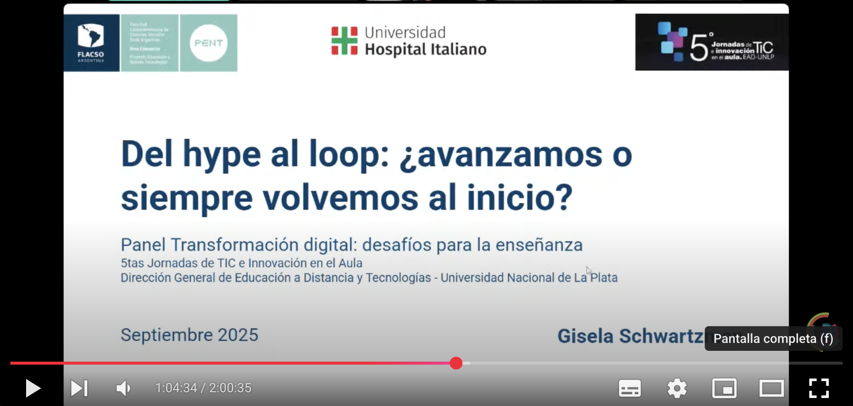 Schwartzman , G. (5 de septiembre 2025). Del hype al loop: ¿avanzamos o siempre volvemos al inicio? En 5tas Jornadas de TIC e Innovación en el Aula. Dirección General de Educación a Distancia y Tecnologías, Universidad Nacional de La Plata. Disponible en: https://www.youtube.com/live/Wb5t5Qdqp3w?si=OSToMpxoD99lJmc8&t=3826.